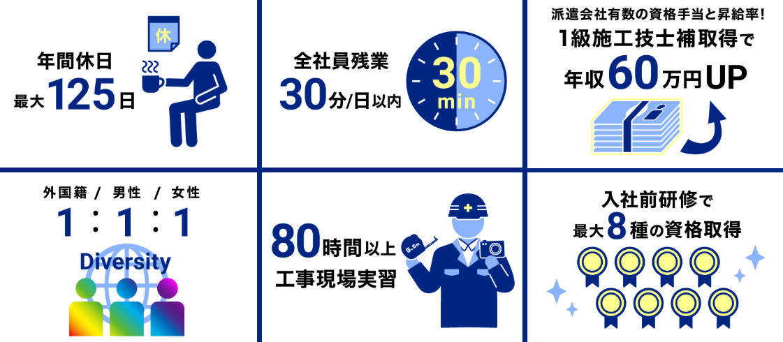 | 施工管理のやりがい | ・建物が完成したときの喜びが大きい ・専門用語がどんどん分かるようになり成長を実感できる ・給与や待遇面がよくモチベーションアップにつながる |