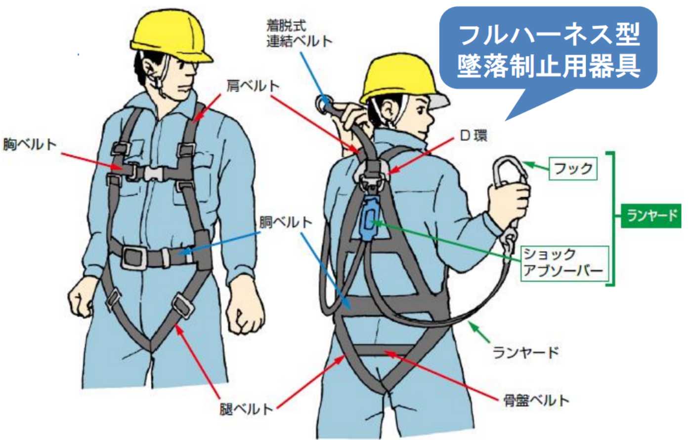 高さ2m以上で作業を行う作業員は、墜落を防ぐための保護具(墜落制止用器具)の装着のほか、安全を確保するためのルールや手順にもとづいた作業を求められます。