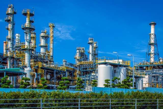 エネルギーや素材を大量に生産するために、複数の設備が配管でつながり連携している大規模な施設のこと。![]() |